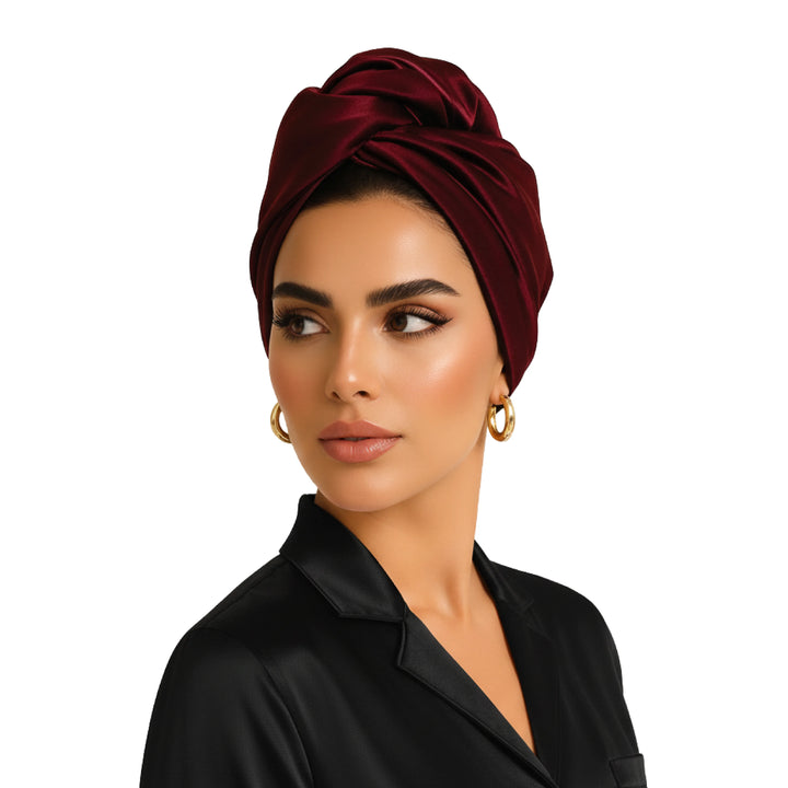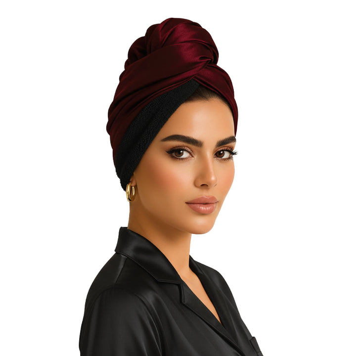 الجانب الحريري مصنوع من أجود أنواع حرير التوت النقي المتين بوزن 22 موم درجة A6 ويستخدم لتجفيف الشعر بلطف دون الإضرار به أو لبسه كغطاء حماية لشعرك أثناء نومك أو في أي وقت خلال اليوم للحفاظ على شعرك