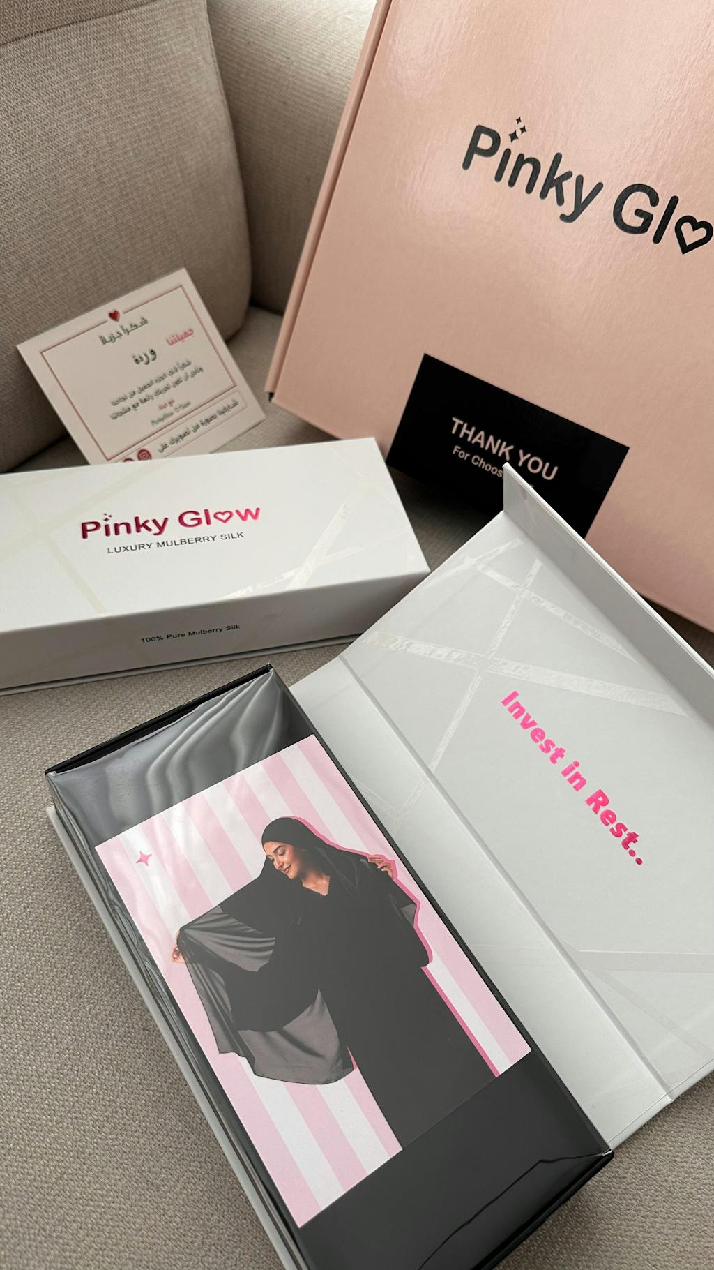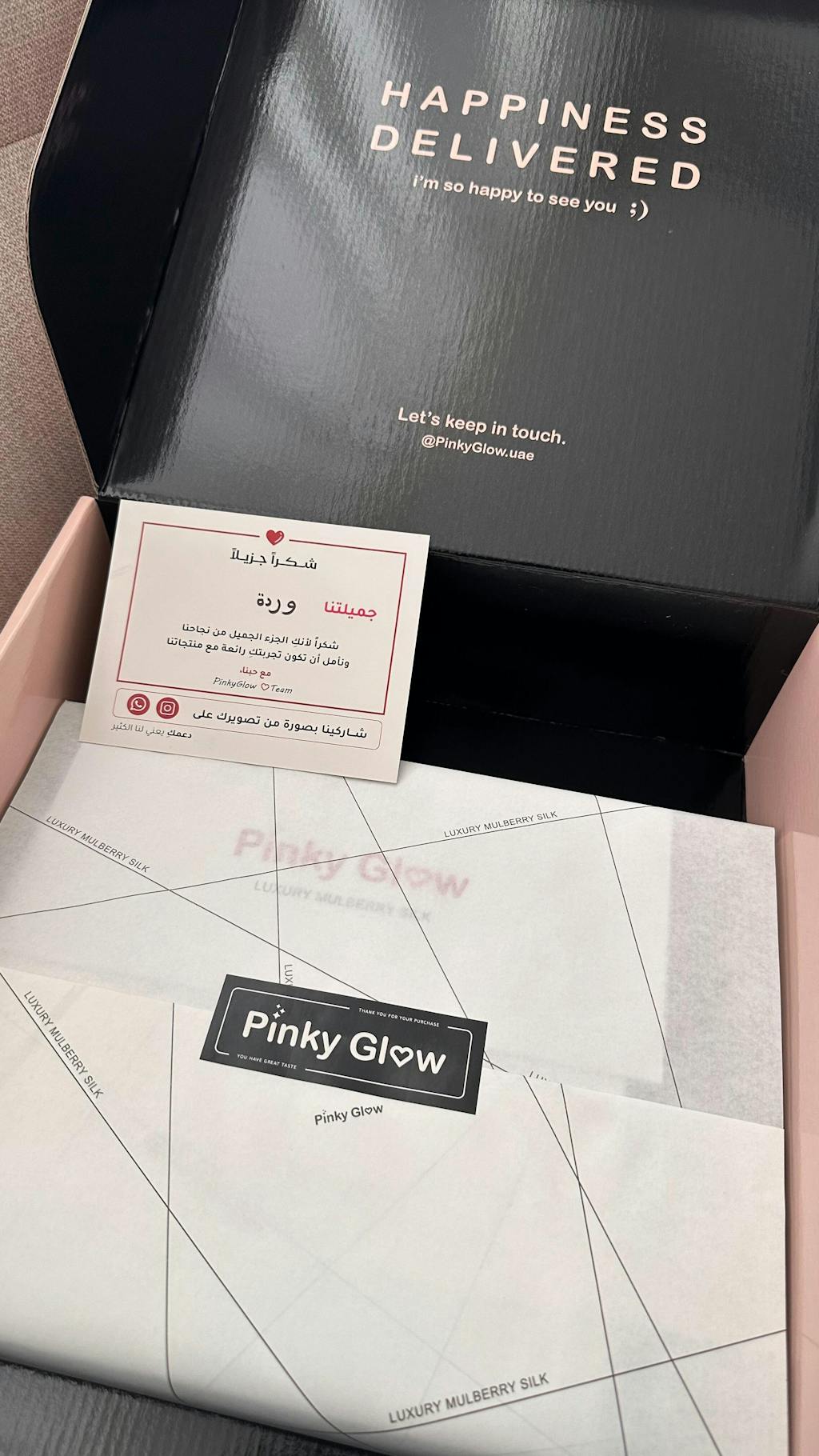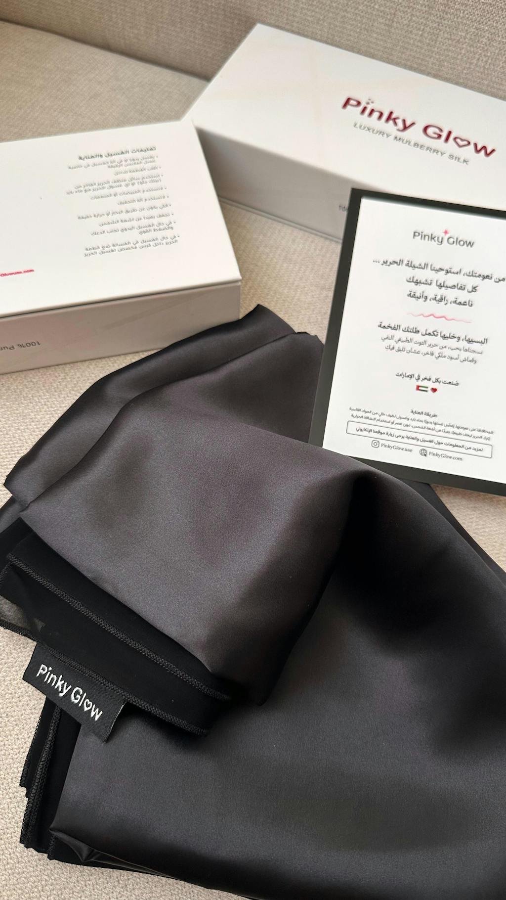 ملاحظة: جميع منتجات حرير بينك جلو حاصلة على شهادة جودة الحرير
